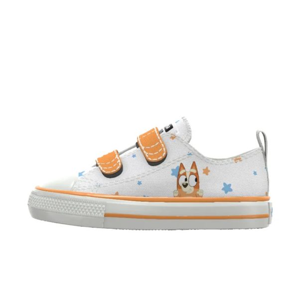 There are also these Bluey Chuck Taylor All Stars featuring the Heeler family! These shoes have the same colorway — coming in light grey with bluey elements on the laces and other parts of the shoe. However, these ones are covered in orange and blue stars. You’ll also find Bluey, Bingo, Chilli, and Bandit all posing on the shoe!