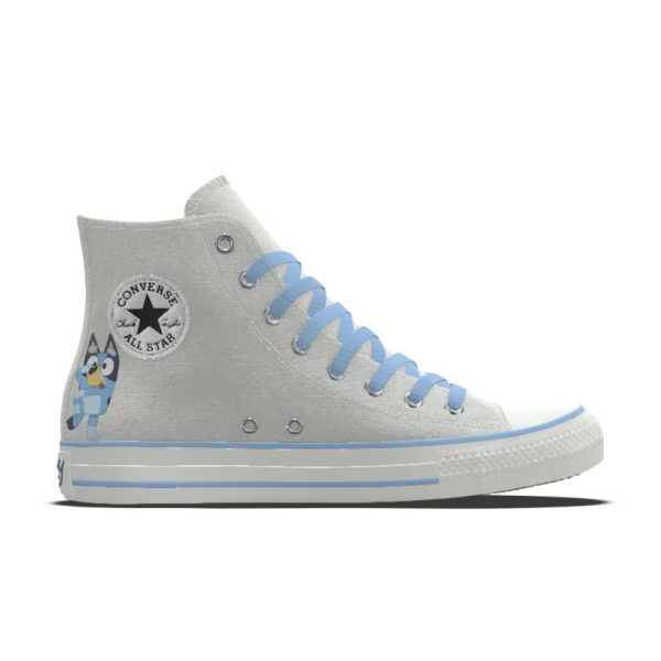 These Converse By You x Bluey Chuck Taylor All Star shoes are adorable! Each shoe has the beloved character, Bluey, on each side of it, dancing in different poses. We love the color scheme with the light grey and blue laces. The more we look at the shoes, the more we fall in love with them!