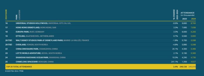 We also got a look at the top 20 U.S. theme parks in 2024. Here, parks like Universal Studios Florida, Universal Islands of Adventure, and Knott’s Berry Farm made the top ten in addition to Disney’s other U.S. theme parks.