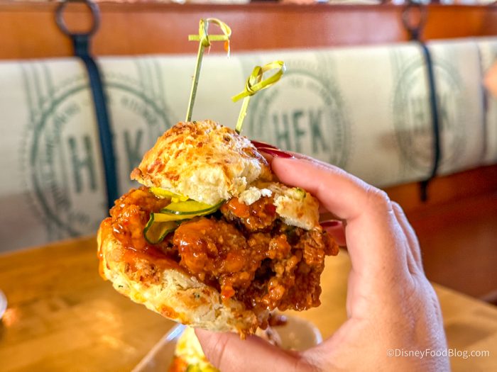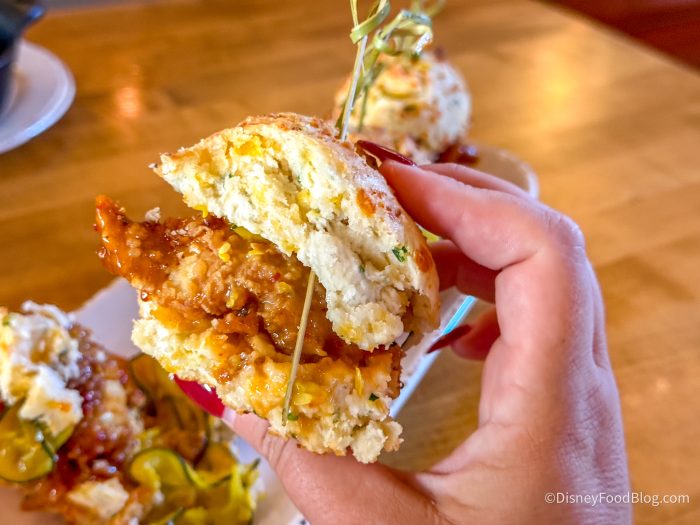 These are BIG and filling, so we honestly recommend getting them as an entree, or splitting them with at least one other person in your party if you want to save room for the rest of your meal. The hot honey here isn’t too intense, but if you’re super sensitive to spice, it’s something to be aware of. The biscuits are the same cheddar biscuits we know and love, and the chicken was nice and crispy while also being tender.