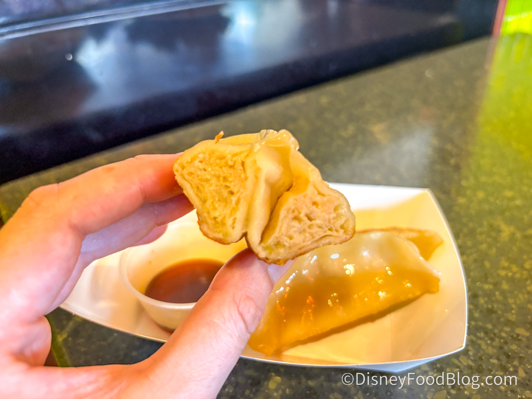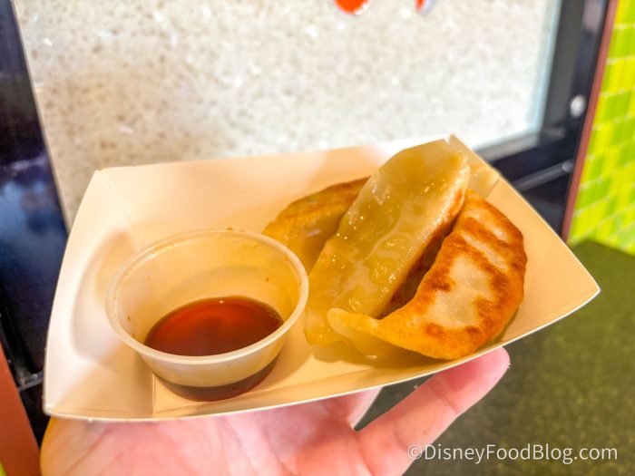 Starting us off, these weren’t quite our favorite. They have a soft exterior with a bit of crispiness from being pan-fried, and while there is a good amount of filling inside, it feels a bit bland. We highly recommend dipping them in some of the available sauces to add more flavor. They reminded us of potstickers from the frozen food section of the grocery store, and while this isn’t a bad thing, they’re not going to be the greatest potstickers you’ve ever had.