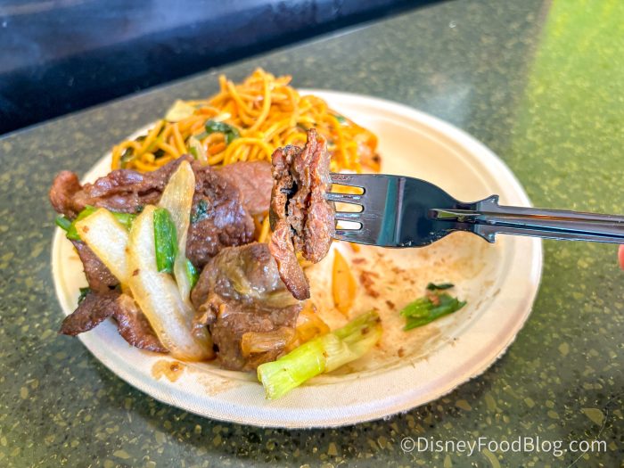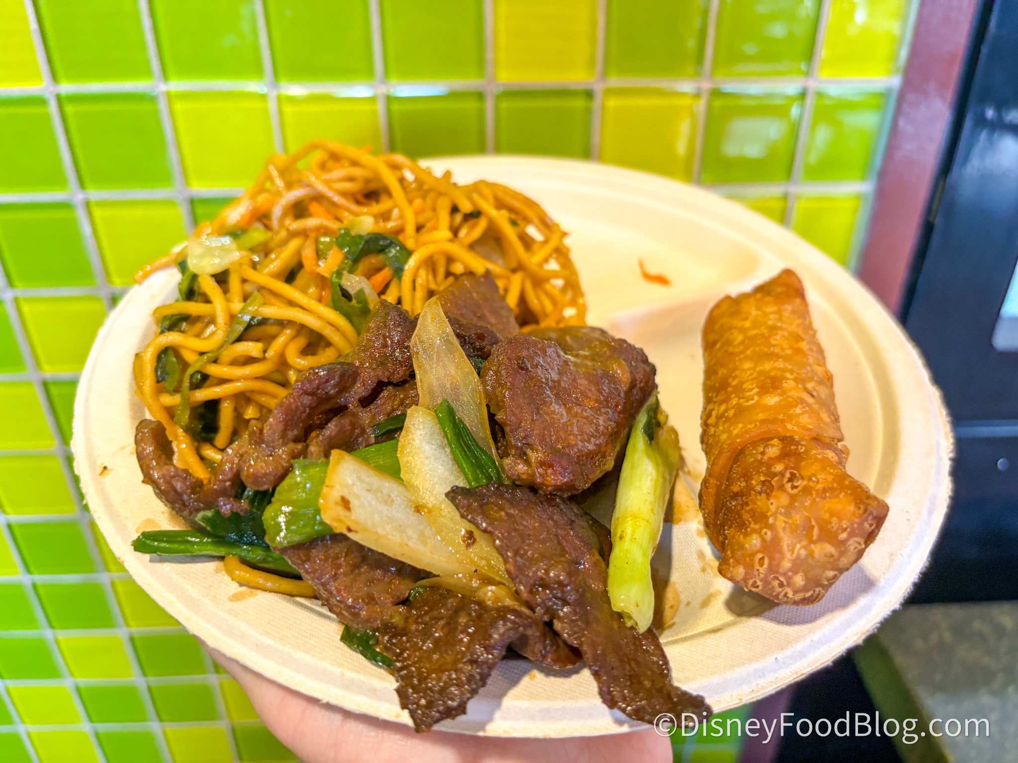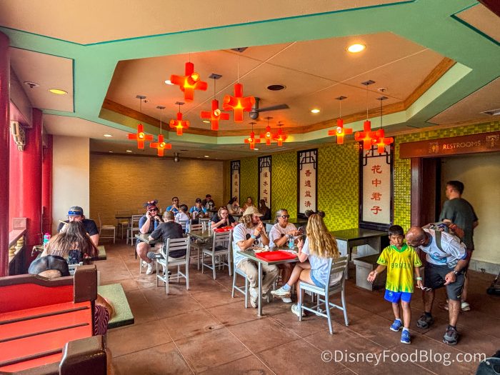 There’s a covered seating area with tables, chairs, and benches, offering great sun coverage during the hotter months. There are so many food booths during EPCOT festivals, and you might be stopping at those limited-time offerings during your visit, but if you come when there isn’t a festival or are looking for some of your favorites, Lotus Blossom Cafe can be great. It’s open from 11 AM to 9 PM, which can be great for a late-night snack.