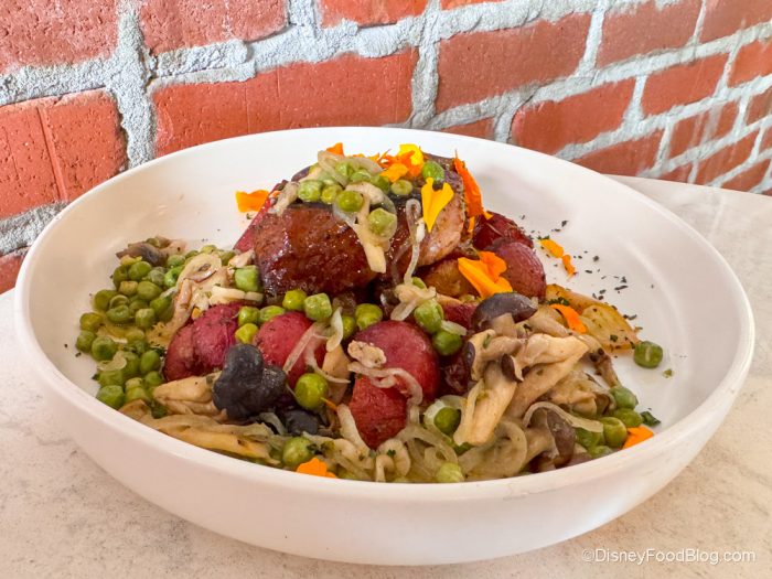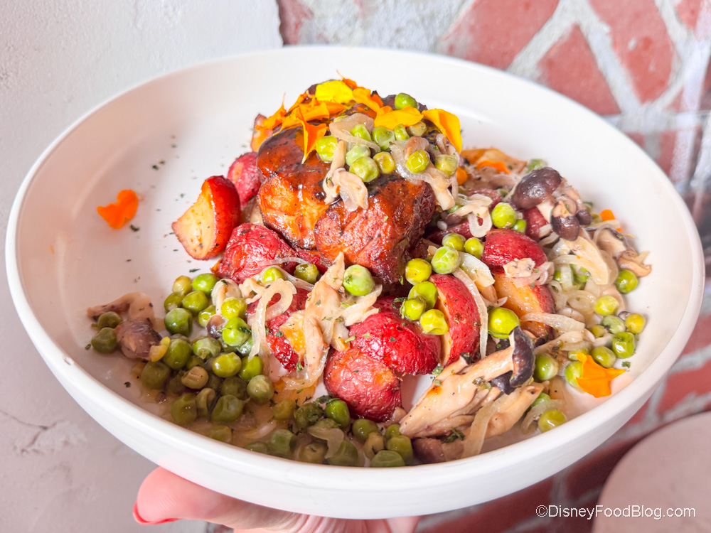 The vegetables are nice, except for the potatoes, which were cooked inconsistently. Some of the potatoes were soft and tender with a nice char, while others were almost a little undercooked. The mushrooms are a little better, but there is still some inconsistency in how they’re cooked, although they’re chewy and add an earthy flavor. We also appreciated that they were cooked enough that they didn’t have that slimy texture that can be off-putting. The peas…are peas. Overall, the vegetables are well seasoned, so we will say that.
