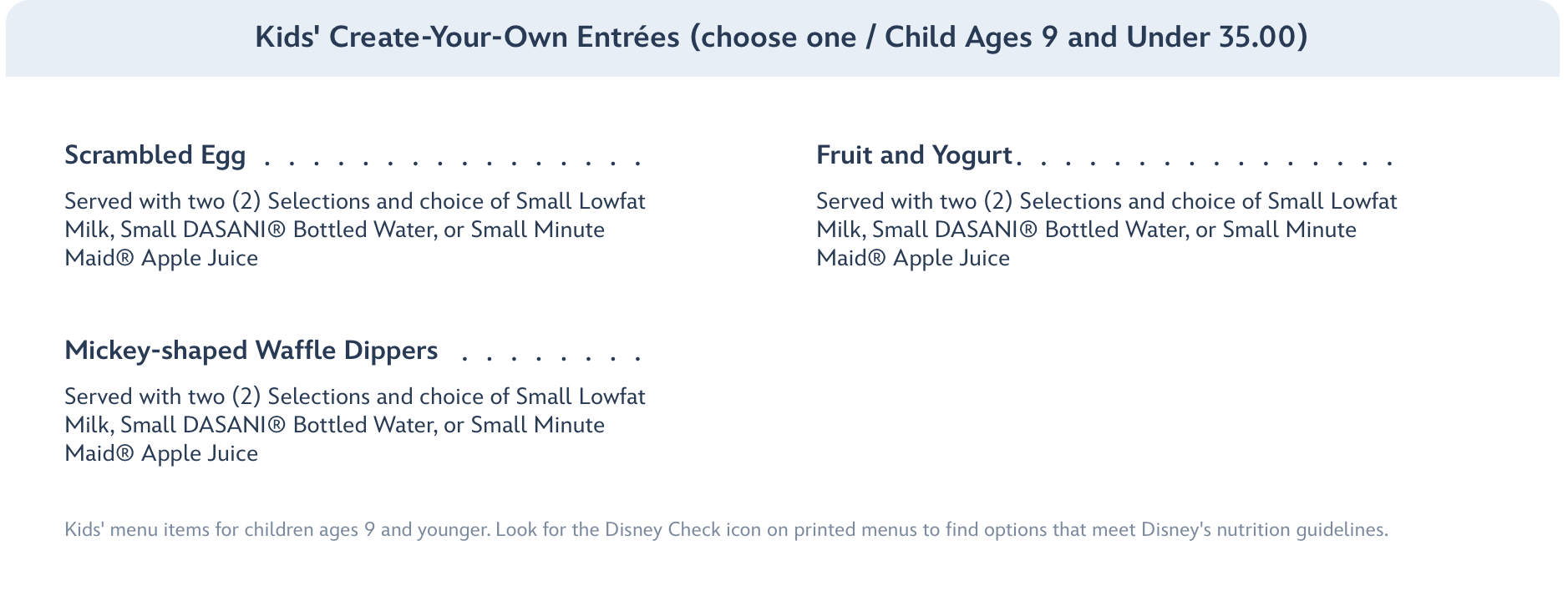 It’s breakfast offering features a choice of entrees for adults costing $54…