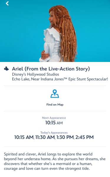 Ariel’s times can be found in the My Disney Experience app, and if you’re having trouble finding her, there’s a map on the app. Ariel is located outdoors, so if it’s raining or bad weather is on the way, her meet and greet might be moved or canceled.