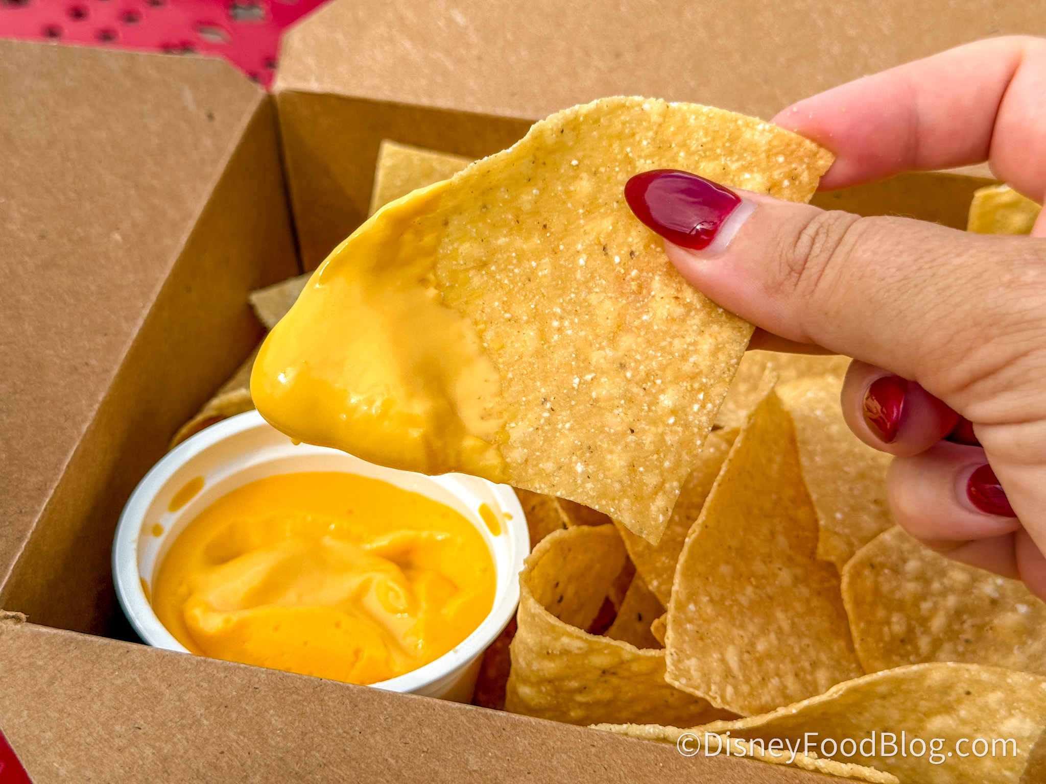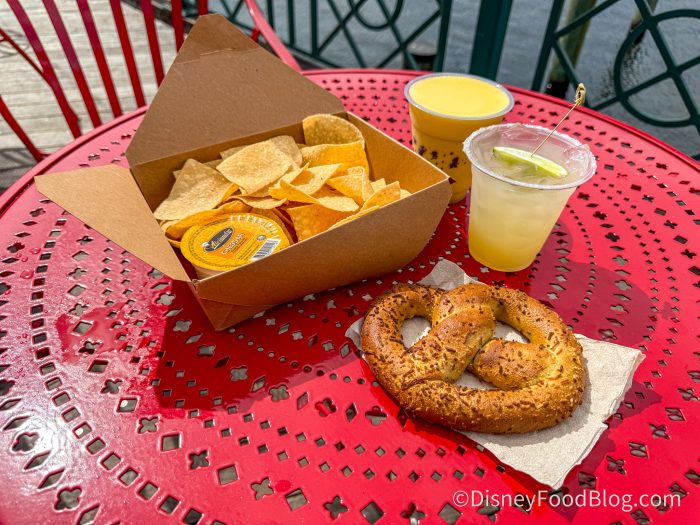 We love this huge portion, especially for a little over $5. It’s an easy portion to share, but it does come with one cup of prepackaged cheese. It’s not quite our beloved plastic cheese that you can grab at Casey’s Corner in Magic Kingdom, but more of its close cousin. It had the perfect consistency — just a bit runny and great for dipping. The chips weren’t too thick or thin but had a perfect amount of crisp without tasting stale. They hold up well to the cheese and have the perfect amount of salt, especially when enjoyed with a salt-rimmed margarita.