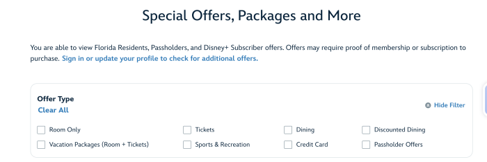 The new layout of the deals and discounts page displays the same special offers, packages, and exclusive deals for Florida Residents, Passholders, and Disney+ Subscribers, but in a new and improved format.