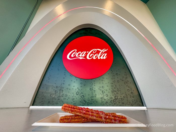 We started off with the special dining option here, which is the Cherry Cola Churro for $7.49. This is a Churro rolled in Cherry Sugar, drizzled with Coca-Cola Cherry Icing, and topped with Cherry Popping Candies. COKE CHURRO! Fun fact — this snack stand is hosted by Coca-Cola, similar to the Ice Cold Hydraulics stand at Disney’s Hollywood Studios.