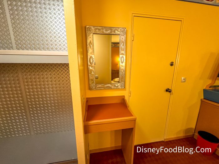 There was also a small desk area with a mirror for a spot to get ready. There was an outlet next to this vanity area for even more places to charge your things.
