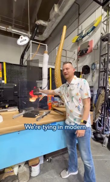 But the part that convinces us this video has something to do with Villains Land is when Imagineer Justin appears on screen, showing off this awesome flame effect that combines modern tech with classic Imagineering tricks. The flame itself is pretty cool…