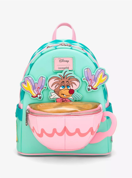 This mini backpack features an applique of the mouse above a figural tea cup pocket, paired with moveable butterflies for an interactive detail. It’s perfect for Alice in Wonderland fans!
