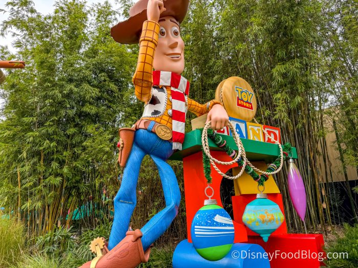 Speaking of Slinky Dog Dash, let’s check out Toy Story Land! Woody was there, greeting us with his scarf on and with massive ornaments on the sign.