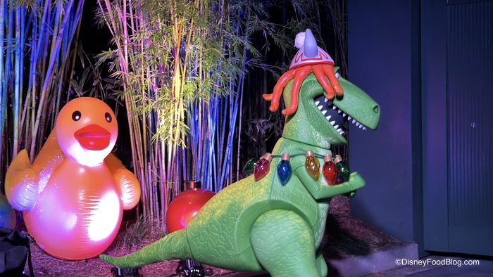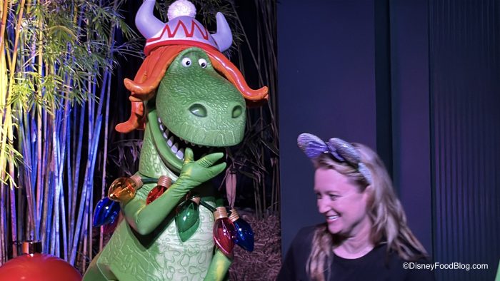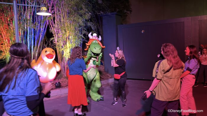 Partysaurus Rex was a popular meet-and-greet as well, and for good reason! Rex was in his party outfit — a Viking helmet, a wig, and a strand of lights for a necklace.