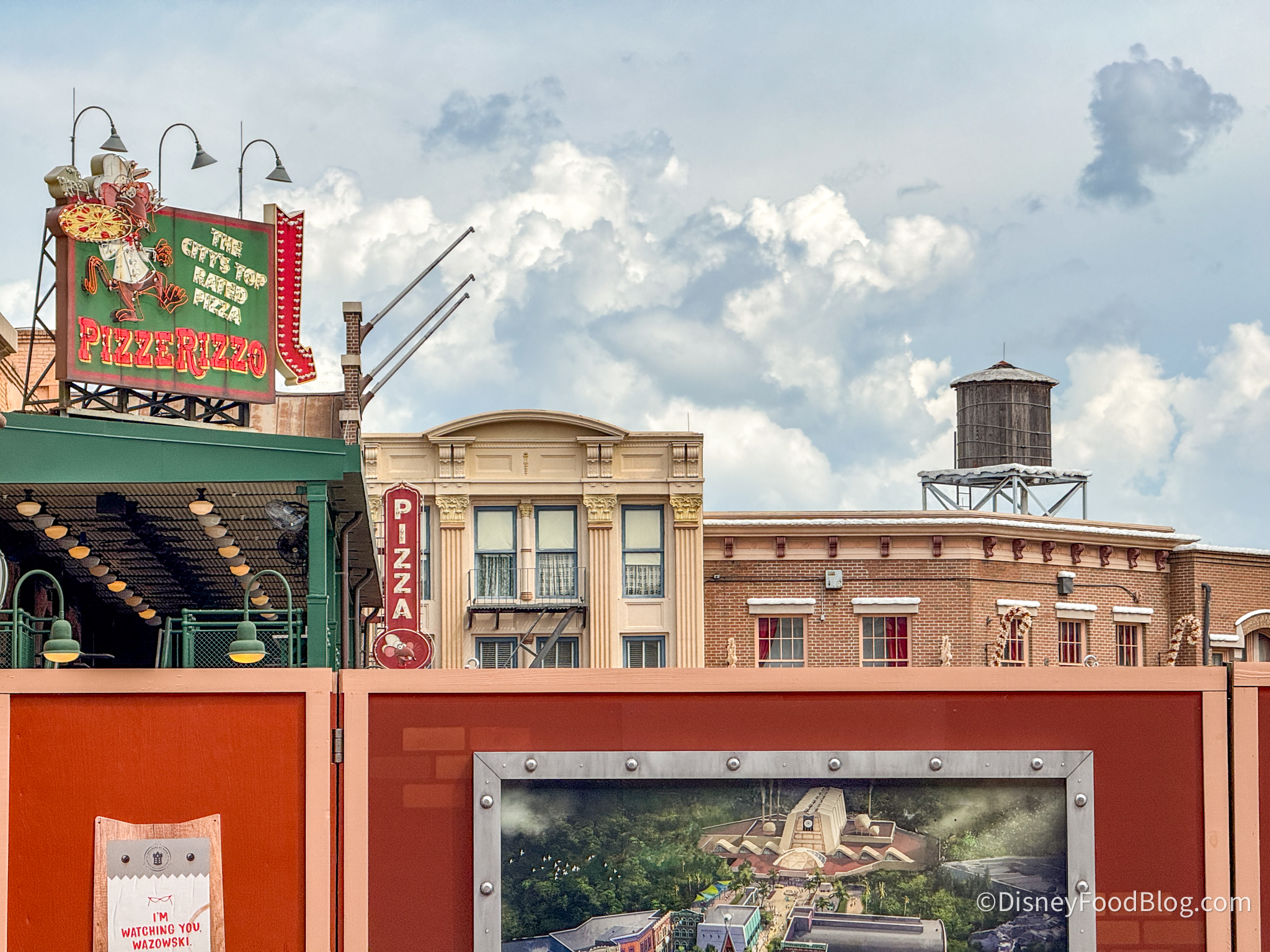 Muppet*Vision, PizzeRizzo, and Mama Melrose’s Ristorante Italiano all reopened this year for Monsters, Inc. themed land. Above the construction walls, we’re slowly seeing signs being taken down as they work on the new hanging door roller coaster behind the space and turn Muppet*Vision into a new show.