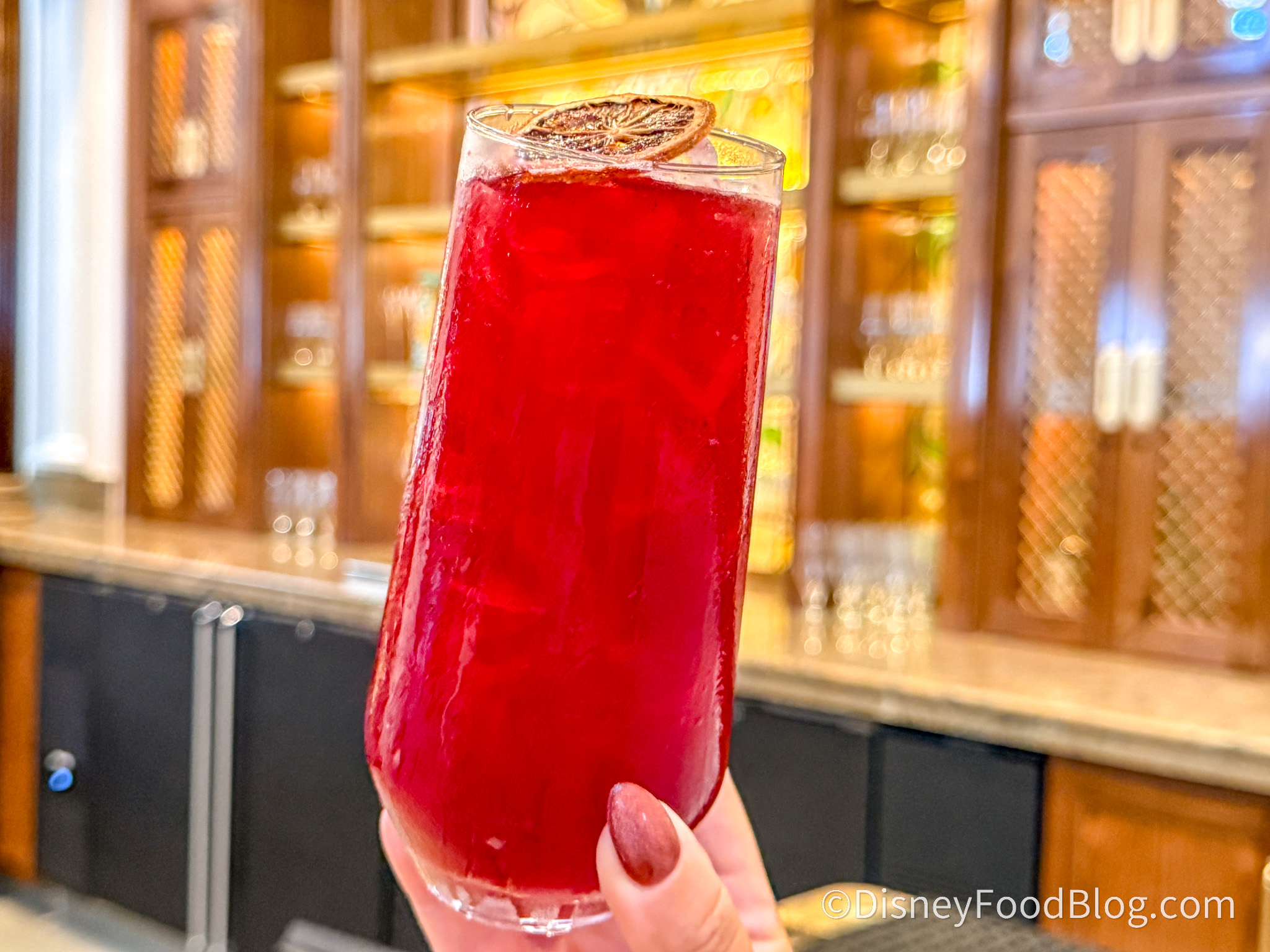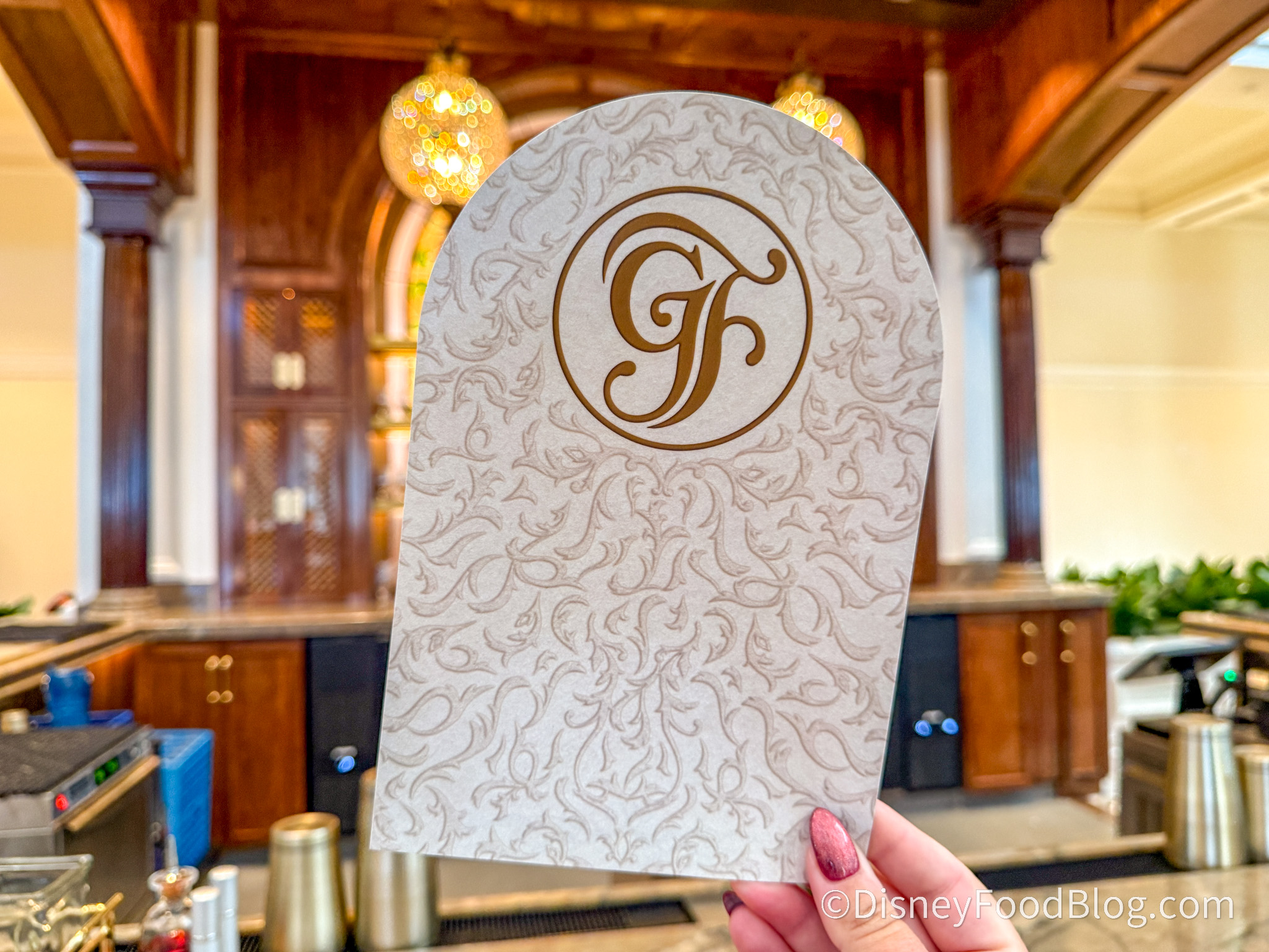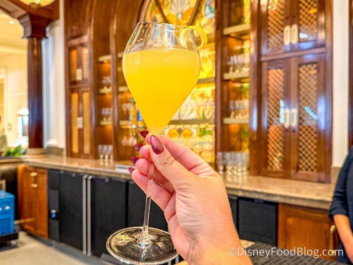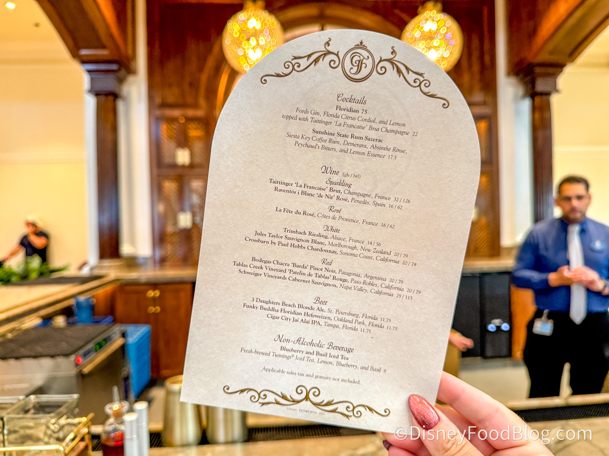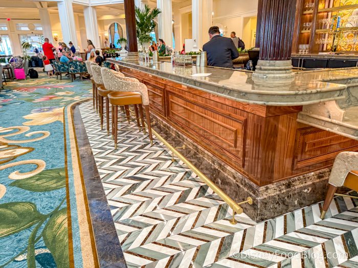 It fits right into the Grand Floridian’s aesthetic with beautiful wood carvings and Victorian-appropriate details, including mirrors, light fixtures, and even the barstools. The details on the bar definitely feel upscale, and you don’t even need to sit at the bar! You can also grab a drink from the bar and find a seat in the rest of the lobby if all the stools are full.