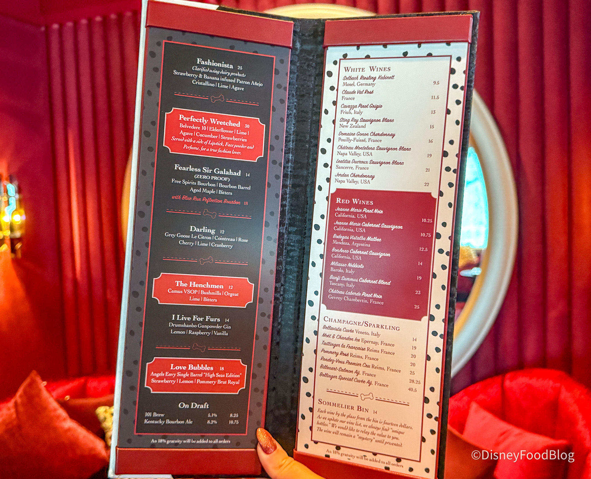 De Vil’s is a one-of-a-kind piano lounge onboard the Disney Destiny, and we were thrilled to take a step back inside. The bar has a Hollywood Regency-inspired aesthetic and is red, white, and black all over.