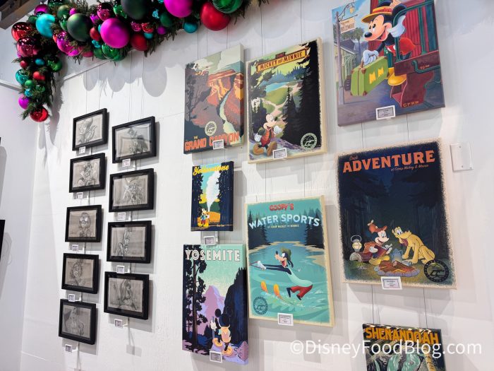 We mentioned that lots of the art here is inspired by Disney movies, and this wall had it all. You can see pieces featuring classic Disney movies like Peter Pan, Mulan, Cinderella, Brave, Alice in Wonderland, and The Nightmare Before Christmas. The garland and ornaments above were a nice festive touch to the display.