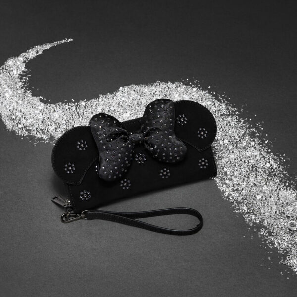 We don’t usually see this style of Loungefly, so we’re going to have to snatch it up! This wristlet has Minnie Mouse ears and a boy, along with those beautiful Swarovski crystals. It was faux suede, a satin trim with seven card slots and one clear ID slot.