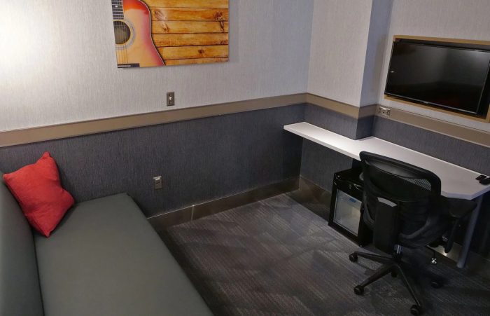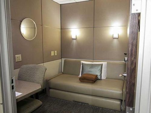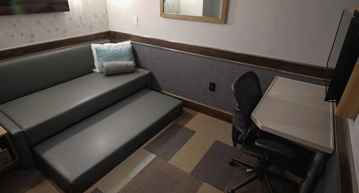 If you’ve never heard of them, they’re essentially small private rooms located inside the airport. Each one comes with a door that locks, a comfy daybed sofa (that can sleep two people), clean pillows, and fresh blankets. There’s also a desk, a desk chair, and charging ports, plus a TV that lets you access DirecTV and Netflix.