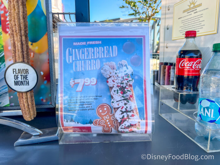 There are two Sunshine Churros locations in Disney Springs, and at both of them, you can grab the Gingerbread Churro for $7.99, which is a churro rolled in gingerbread sugar, drizzled with buttercream frosting, topped with crunchy gingerbread cookie crumbs, and a sparkle of edible glitter.