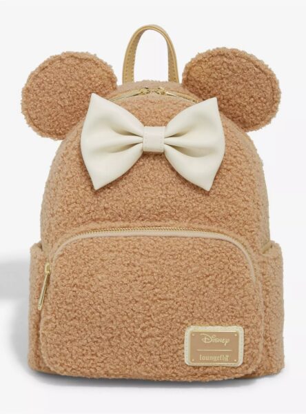 It’s so fuzzy, and this is perfect for winter vibes (especially in Florida). It looks like a big ‘ole teddy bear (Duffy vibes, anyone?), and the white bow makes it even cuter and more cuddly. The mini backpack is the traditional style with a front pocket, main pocket, and two small side pockets.