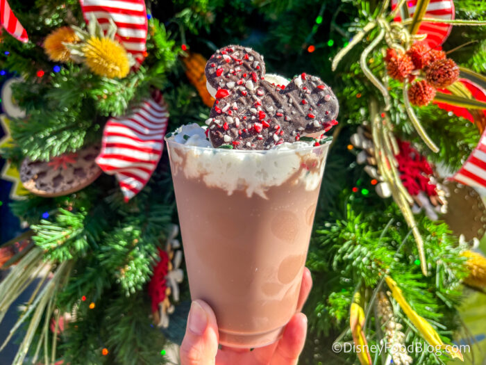 Over at Goofy’s Candy Company, you can find a limited-time offering, Frozen Cocoa! You can grab this seasonal treat for $8.99. It is made with Joffrey’s frozen cocoa, topped with whipped cream, mini marshmallows, a mini candy cane, and a Mickey marshmallow with chocolate and crushed peppermint. We thought the toppings looked great — although the candy cane kept slipping into the drink, trying to avoid being captured. We promise the mini candy cane is in there, though!