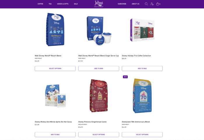 If you’re a serious coffee lover and want to make sure there’s never a lull, you can also sign up for their subscription service. They have 3 different options, but you can also sign up for the Disney Coffee Collection. You can select between ground or whole bean and receive 3 specialty flavors curated by the team.