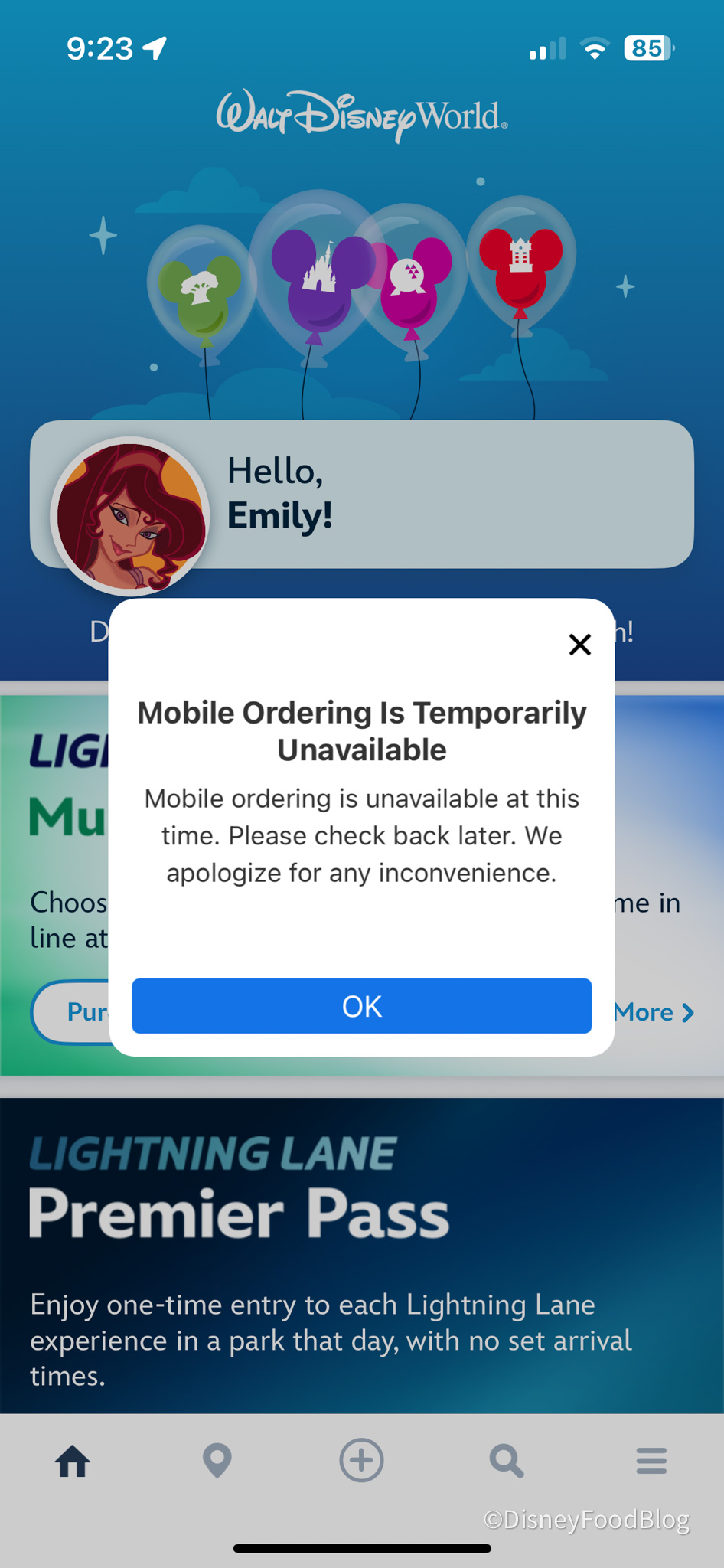 We’ve got bad news if you’re at Disney World today — the Mobile Order feature on the My Disney Experience app, which allows you to order food from your phone and go pick it up, is currently down.