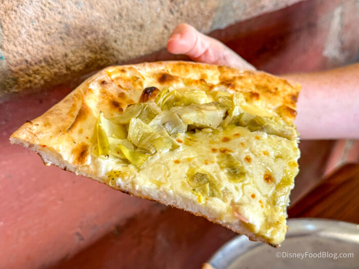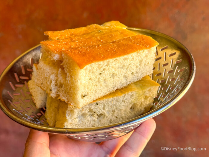 Our other appetizer was the Homemade Focaccia with sides of marinara and Italian extra virgin olive oil and herbs for $8.50, which was extremely delicious with a beautiful quality olive oil for dipping. At first, we thought the olive oil was herbed and fragrant, but then we realized there were pieces of rosemary inside the focaccia itself, which made more sense, and it made us love it even more. The texture of it was bouncy on the inside with a great crust on top, and we think this is a totally underrated bread service in EPCOT — it’s at the top of our favorites list now!