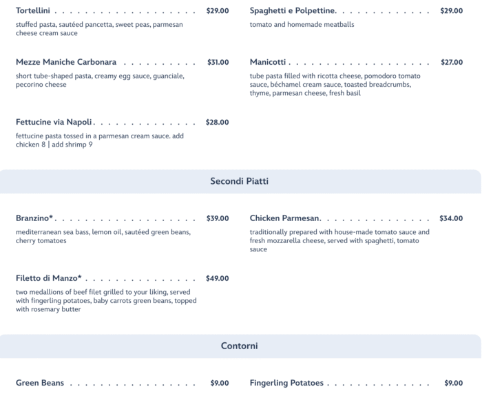 Getting into the main entree options, you’ll find lots of pasta available in many different shapes and sizes, as well as items like Chicken Parmesan and Branzino. There are also two sides available, called Contorni, which are Green Beans and Fingerling Potatoes.