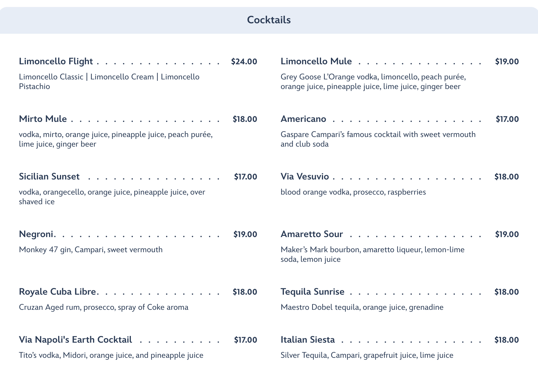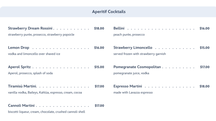 Finally, there are also Aperitif Cocktails available, which are often served after dinner, but you can order them whenever you’d like!