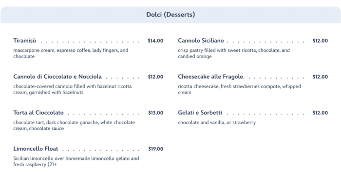 It’s not a meal without dessert, right? Via Napoli is home to seven different desserts, including Tiramisù, Cannolo, and Cheesecake.