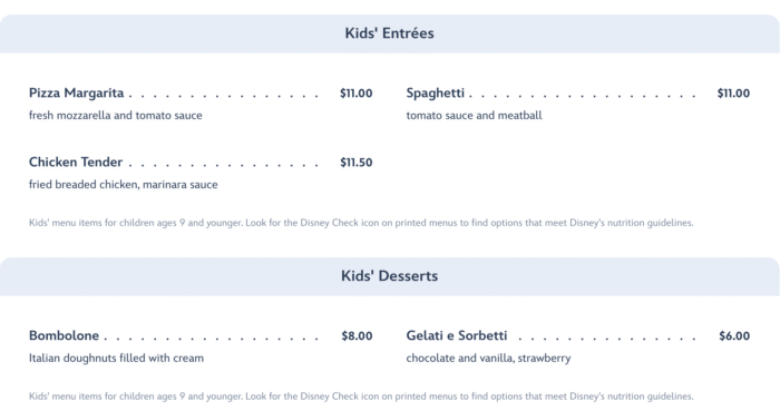 There is also a Kids’ Menu available, but remember that this is only available for kids aged 3-9, and table service restaurants are pretty strict about that!