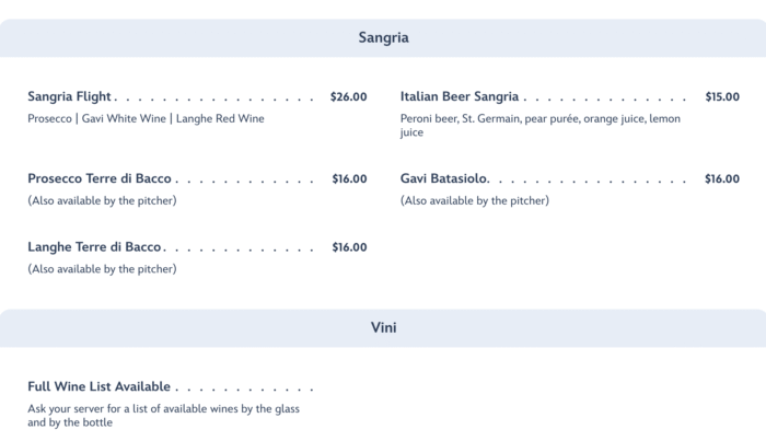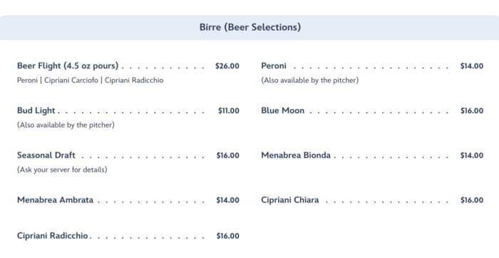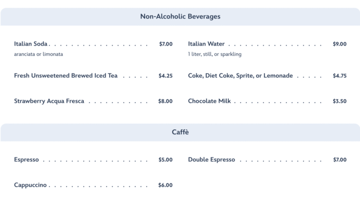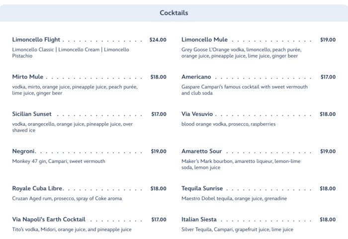 When it comes to the drinks, you’ll find soda, lemonade, Italian Water and Soda, coffee, and milk available, but finding non-alcoholic mocktails won’t really be on the menu here.