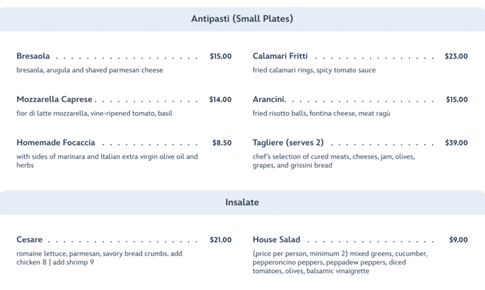 As this is an Italian restaurant, those are the items you’ll find on the menu! There are six different Antipasti (Small Plates) on the menu, as well as a Cesare and House Salad.