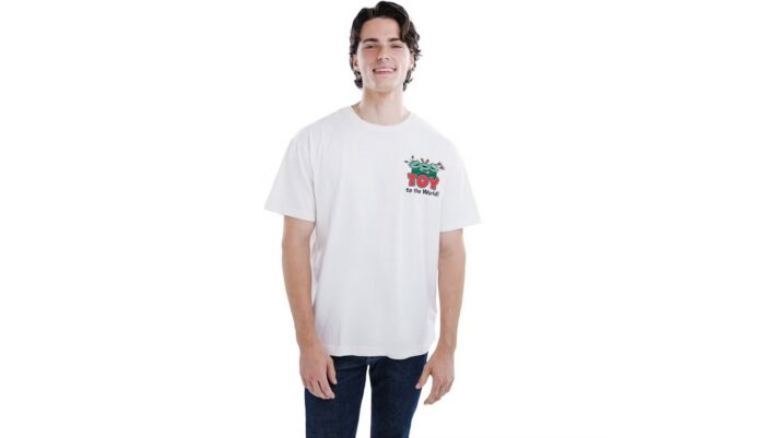 You can grab this Holiday Toy Story Shirt online at Target right now! The front has a small logo featuring the little green aliens with the text, “TOY to the World!”