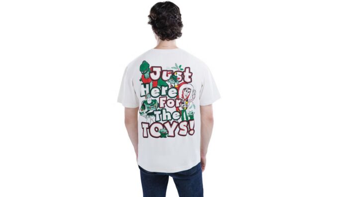 The back of this adult t-shirt (which is available in different colors and sizes) features a much bigger print, with other characters in festive outfits amid lettering that reads, “Just here for the toys!”