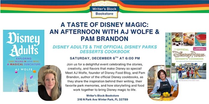 The bookstore is promising “a lively chat between AJ Wolfe, author of ‘Disney Adults’, and Pam Brandon, where they’ll be sharing stories and insights!” There will be a lot of discussion about all things culinary and Disney, from restaurant reviews to latest food trends. It’s going to be HIGHLY entertaining and fun!
