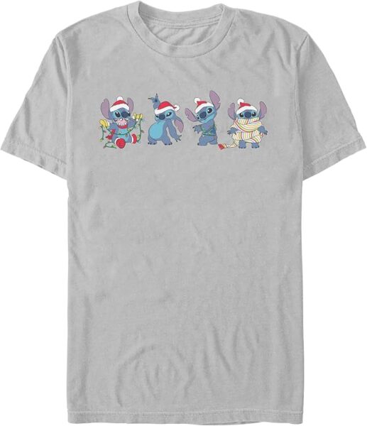 The Stitch Lineup Holiday Shirt can be yours right now on Amazon! This ice grey men’s medium shirt features Stitch looking as cute as ever in four different poses (and literally getting tangled up)– all displaying a jolly Christmas theme.