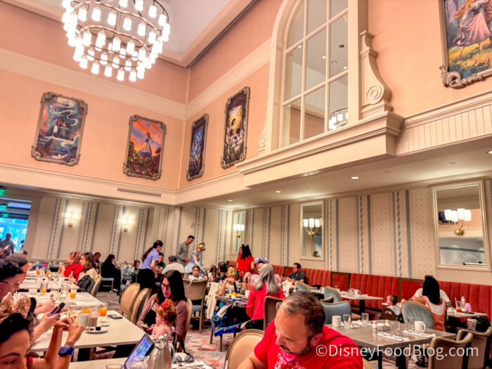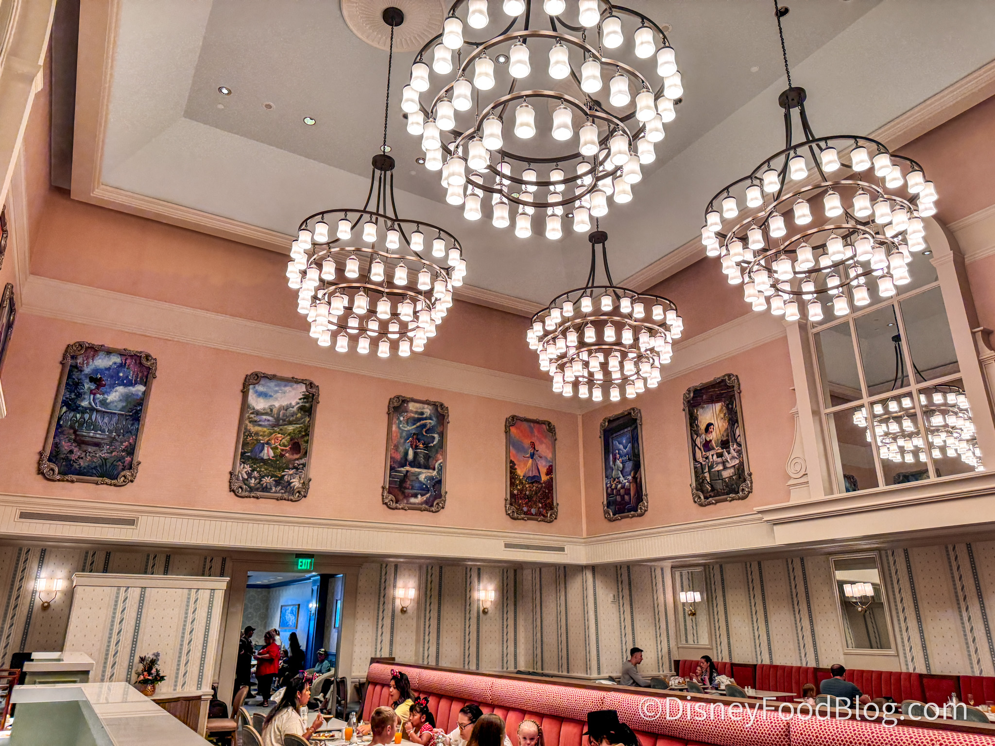 Located in the Grand Floridian, 1900 Park Fare brings a similar aesthetic into the restaurant. There are nods to the early 20th century with carousel theming, whimsical decor, and impressionist-style Disney artwork. Make sure you look up when you enter the dining room to see gorgeous portraits of Disney characters and check out the turn-of-the-century organ from France that’s been at the Grand Floridian since 1988. It’s called Big Bertha.