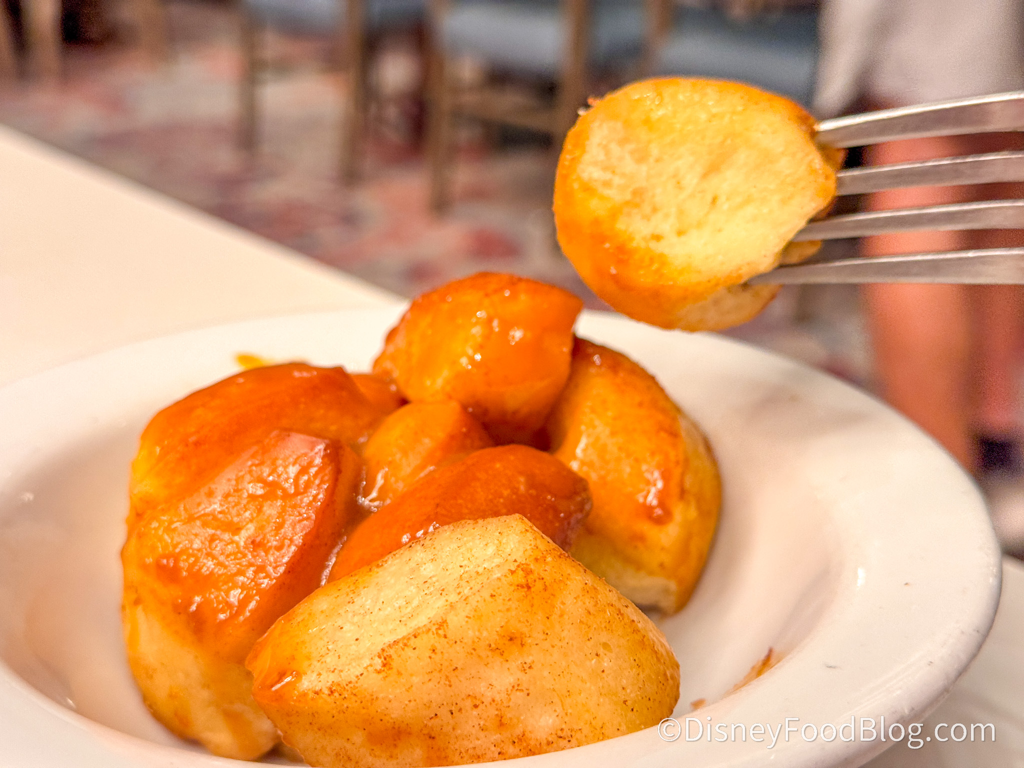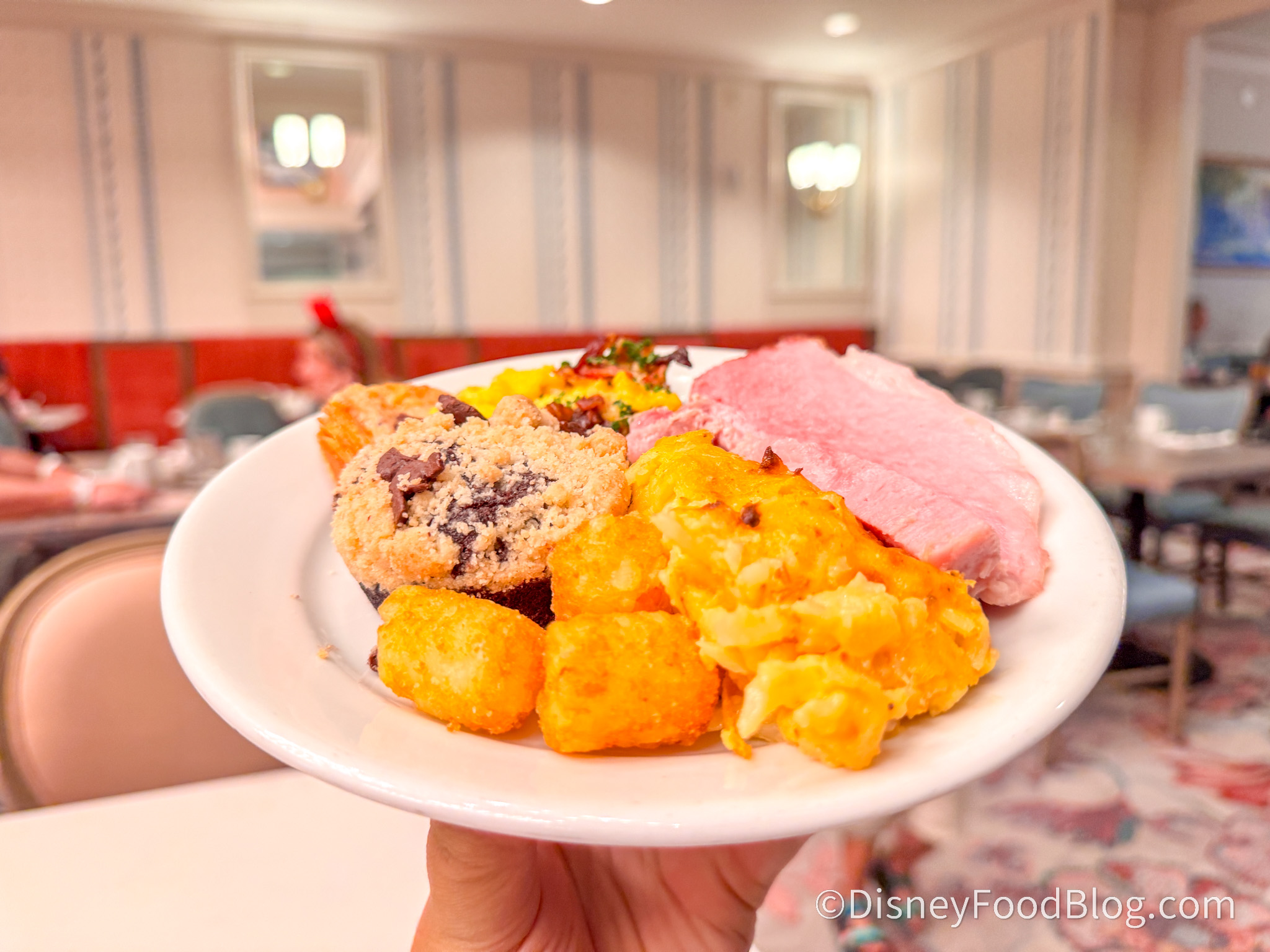 Once we saw the chefs put out a fresh batch, we piled a few Tator Tots on our plates. No, these were not insanely unique, but they were crispy, hot, and fresh, and honestly, sometimes you just need something you know you’re going to love. In addition to those potatoes, we also got the Cheesy Potato Casserole. For us, this is a staple of Disney buffets, and we hardly skip on it. They’re creamy and salty with the perfect balance of cheese and potato. You just have to have them!