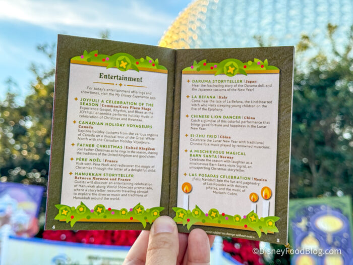 Then, you can find more information about all the live entertainment going on for the festival, such as the holiday performers in the World Showcase pavilions and more.
