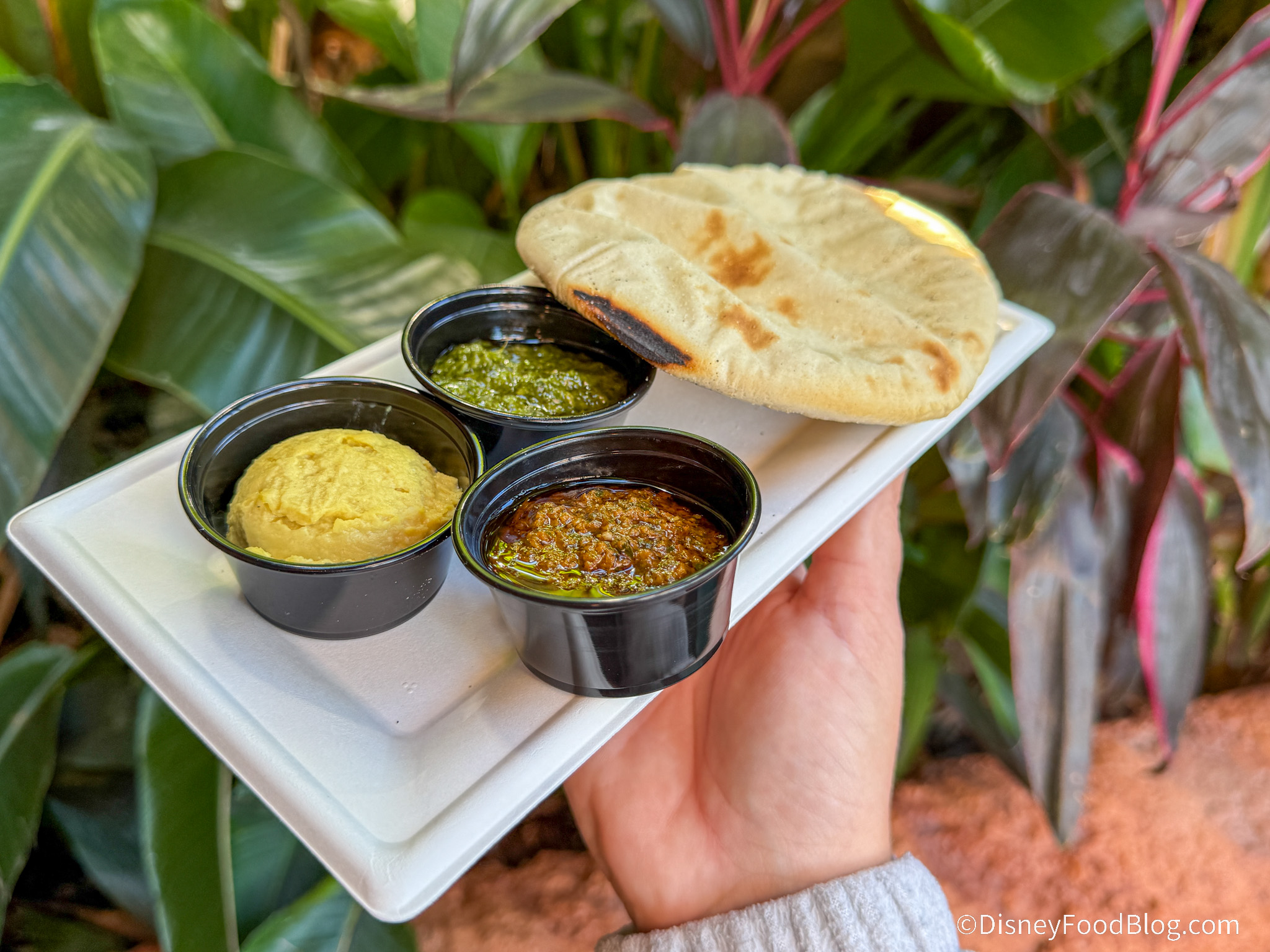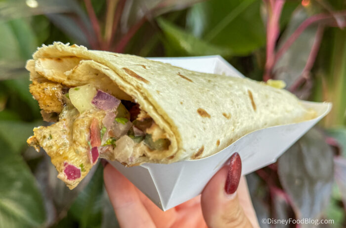 The Moroccan Wrap was on the menu at this year’s EPCOT Food & Wine Festival, and it’s back for the holidays. You can get the wrap with Chermoula Chicken, Moroccan-spiced Lamb, or the plant-based Falafel for $6.25. We got the Falafel one and the Chicken one, but the Falafel was probably our favorite. The falafel is a little dry on the outside, but the inside is nice and crumbly. You also get a very full flavor mix with the vegetables.
