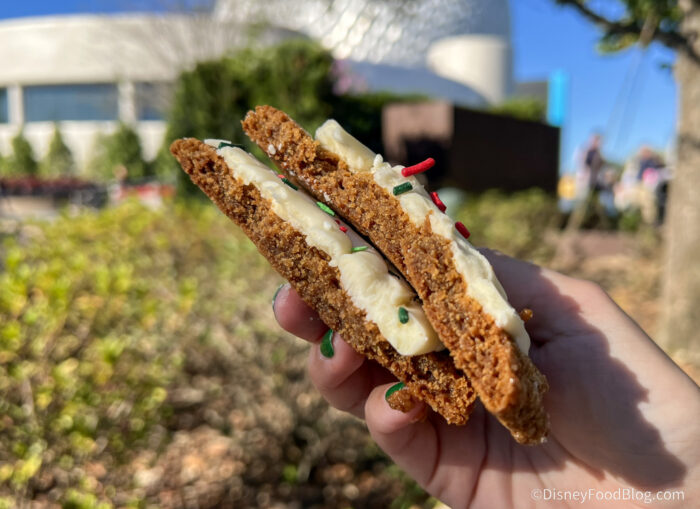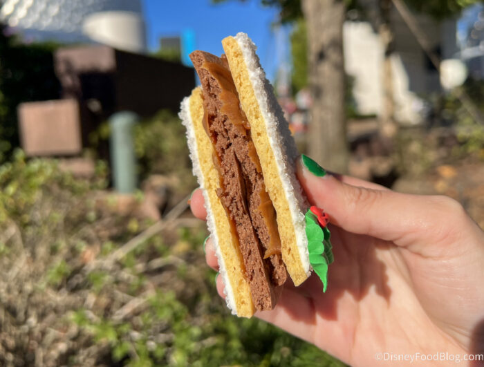 You may already recognize it for its iconic shape. It is two sugar cookies sandwiched together with a thick layer of caramel in the middle. There are pops of salt throughout, and the top of the cookie is coated in crunchy sugar. It isn’t a unique tasting cookie, but it does taste good! Plus, it is adorable and perfect for some fun photos by Spaceship Earth.