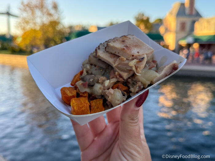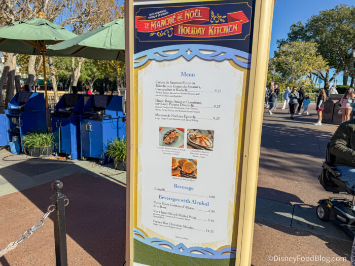 Well, we’re doing the next best thing here by visiting Le Marche De Noel! It’s one of the Holiday Kitchens (also known as Food Booths) at the 2025 EPCOT Festival of the Holidays, and it’s located in the France Pavilion. Even though there is SO MUCH to do at the Festival (like take a Cookie Stroll, check out the Candlelight Processional, listen to Holiday Storytellers around the park, and more), we hope you’ll take a moment to join us at the Le Marche De Noel as we bring your our FULL review!