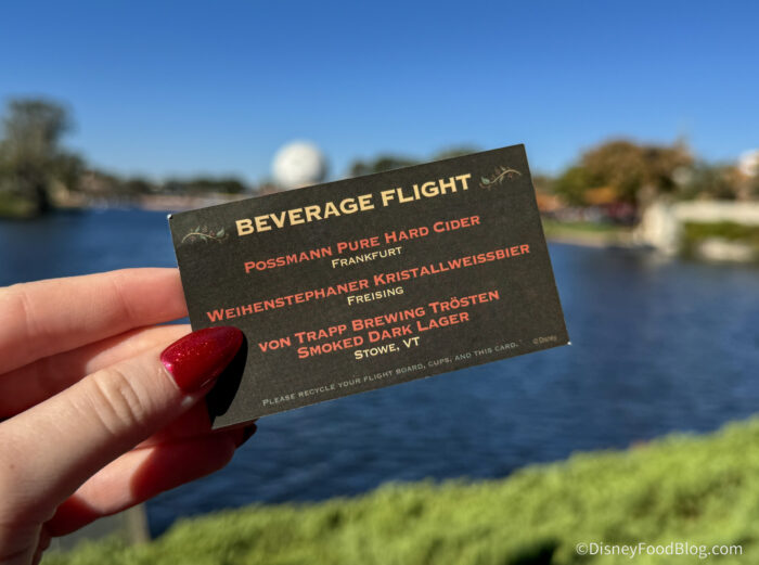 The Beverage Flight is somewhat unique here in that it’s a mix of beer and hard cider: Weihenstephaner Kristallweissbier and von Trapp Brewing’s Trösten Smoked Dark Lager comprise the beers, and Possmann Pure Hard Cider completes the beverage trio.