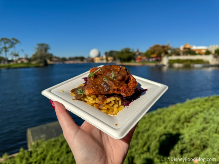 German classics are on the menu at the Bavaria Holiday Kitchen, which is possibly best known for Cheese Fondue in a bread bowl year after year at the Festival of Holidays. The Pork Schnitzel is also back, and this is also where you can find the Hazelnut Linzer Cookie.