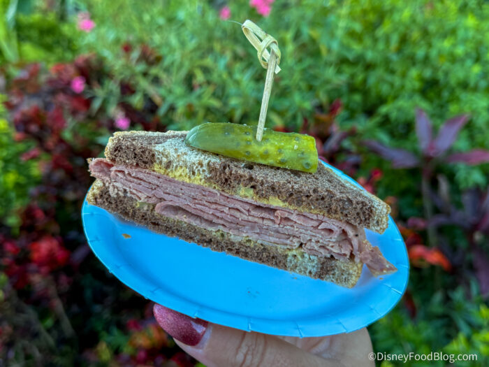 There is one new-ish item on the L’Chaim menu this year. Yes, they’ve consistently served a Black and White Cookie here, but it’s received a Mickey makeover this year! Meet the Mickey-shaped Almond Black and White Cookie! It’s $4.00. And, remember, it’s also eligible for a stamp in your Festival Passport if you’re participating in the Holiday Cookie Stroll. This is just a nice and simple almond cookie. There’s almost a fruity taste at the back of the throat, though.
