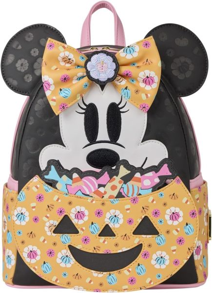 Spooky season may be long gone, but this pumpkin-cutie bag feels like a year-round staple if your aesthetic leans colorful and playful. Minnie peeks out from behind a candy bowl jack-o’-lantern, and the candy bowl doubles as the front pocket. The pattern of candy corn and pumpkins shows up on the back, the bow, and the sides. Oh, and it glows in the dark and is candy corn scented. This is the definition of whimsical. Getting it under 60 dollars is wild.