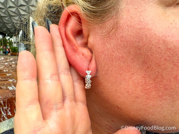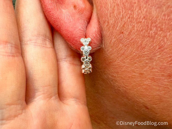 These hoop earrings feature an endless hoop design with repeated cubic zirconia Mickey Mouse pendants and a hinged back closure, making them perfect for a day at Disney World… or simply a day you wish were at Disney World.